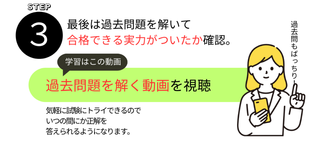 過去に出された問題、出題予測問題を解いてみて、7割以上の正解率が大切です。解いてみる問題数が多いほど、正解率が上がるほど合格出来る実力を身に着けたと実感できるとおもいます。